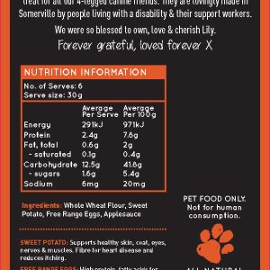 Sweet potato: supports healthy skin, coat, eyes, nerves & muscles. Fibre for heart disease and reduces itching